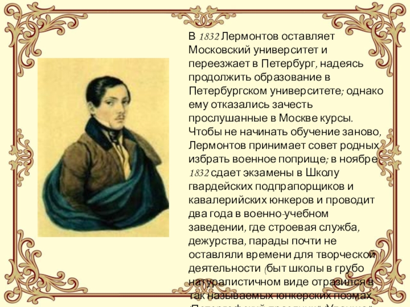 продолжить образование в Петербургском университете; однако ему отказались зачесть прослушанные в Москве курсы. Чтобы не начинать обучение заново, Лермонтов принимает совет родных избрать военное поприще; в ноябре 1832 сдает экзамены в Школу гвардейских подпрапорщиков и кавалерийских юнкеров и проводит два года в военно-учебном заведении, где строевая служба, дежурства, парады почти не оставляли времени для творческой деятельности (быт школы в грубо натуралистичном виде отразился в так называемых юнкерских поэмах - "Петергофский праздник", "Уланша", "Гошпиталь" - все 1834)