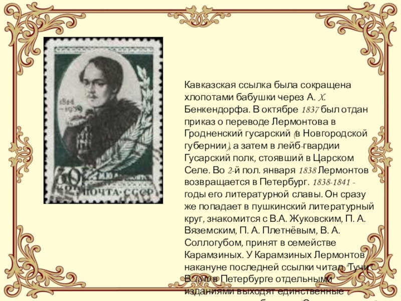 Слайд 17Кавказская ссылка была сокращена хлопотами бабушки через А. X. Бенкендорфа. В