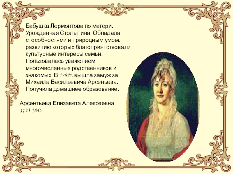 Слайд 5Бабушка Лермонтова по матери. Урожденная Столыпина. Обладала способностями и природным умом,