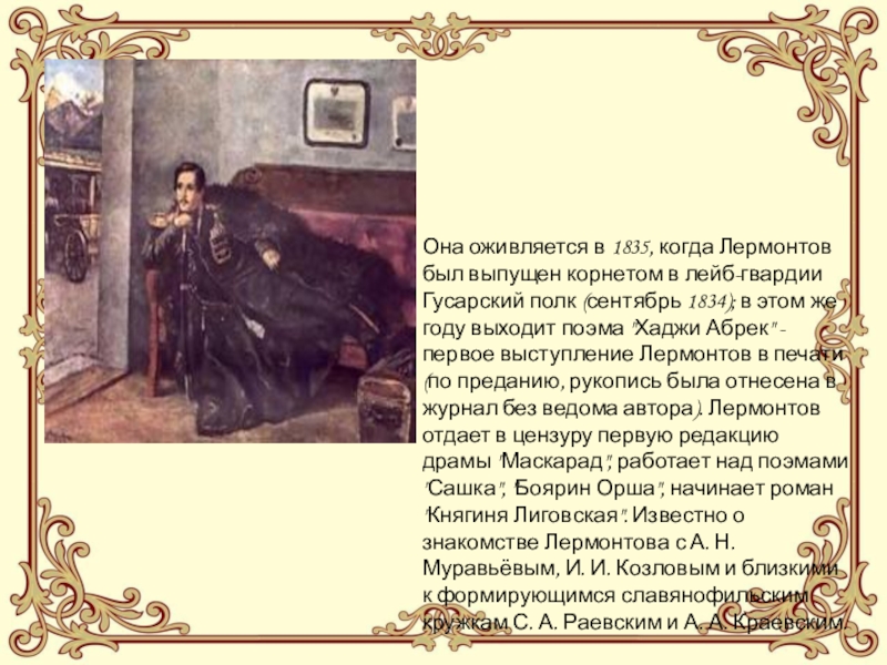 Слайд 12Она оживляется в 1835, когда Лермонтов был выпущен корнетом в лейб-гвардии