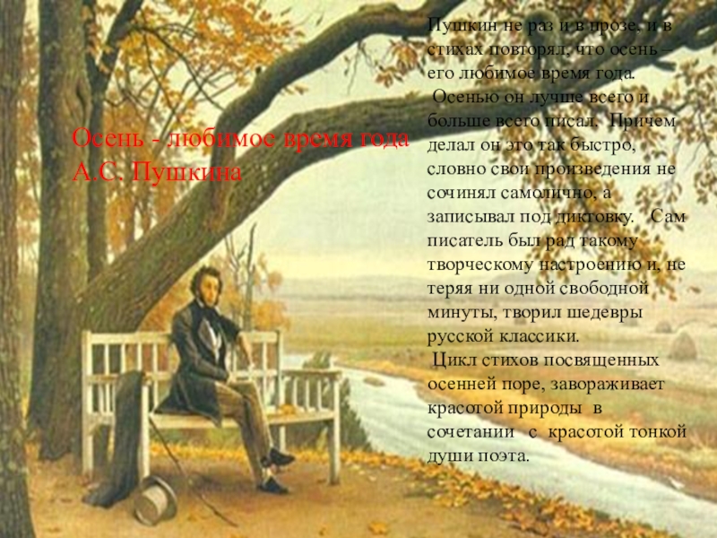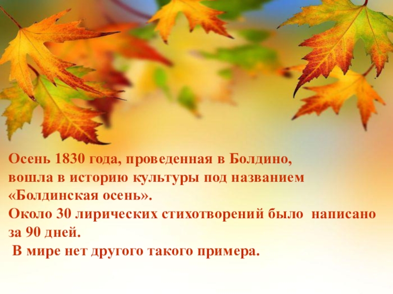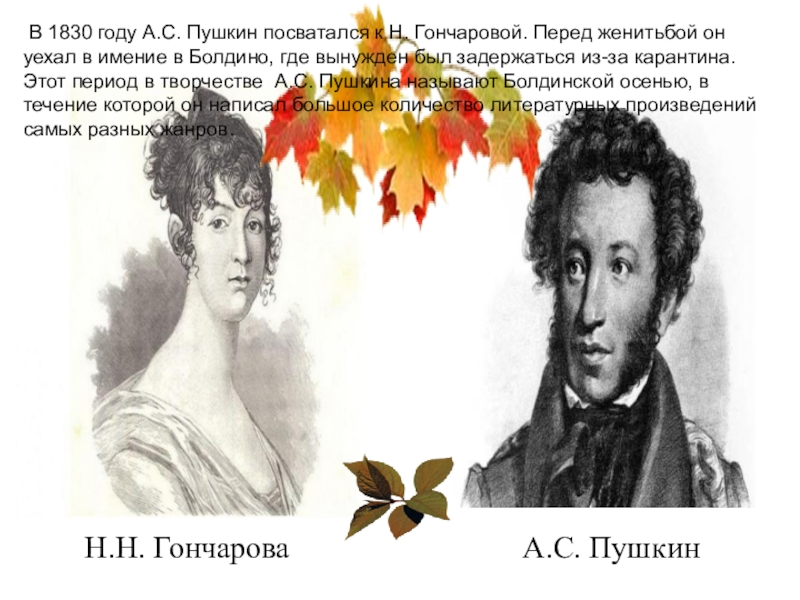 В 1830 году А.С. Пушкин посватался к Н. Гончаровой. Перед женитьбой он уехал в имение в Болдино, где вынужден был задержаться из-за карантина. Этот период в творчестве А.С. Пушкина называют Болдинской осенью, в течение которой он написал большое количество литературных произведений самых разных жанров.