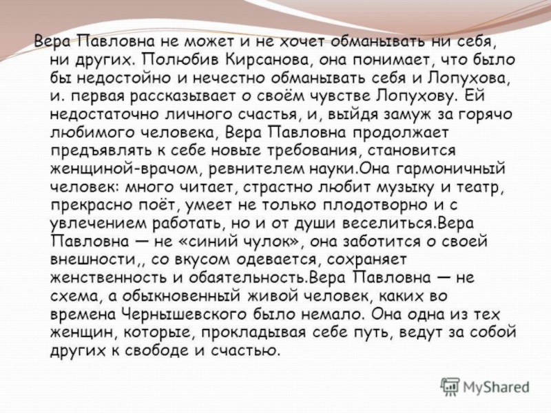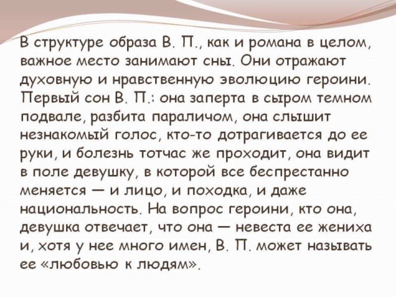 Верочка встала, идёт, бежит, и опять она на поле, и опять резвится и бегает. «А вот идёт по полю девушка, — как странно! И лицо, и походка — всё меняется, беспрестанно меняется в ней».
