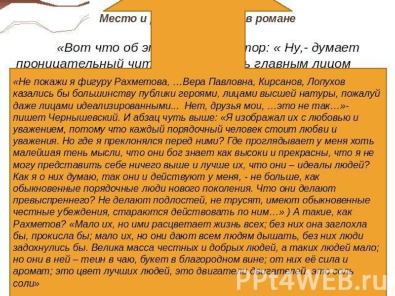 К этому роману нельзя приложить привычные мерки того времени. В произведении Чернышевского мы имеем дело с философско-утопическим романом. Мысль в его романе преобладает над непосредственным изображением жизни. Не случайно роман был оценён революционно-демократической интеллигенцией не как собственно художественное произведение, а как программное произведение по социалистическому переустройству жизни
