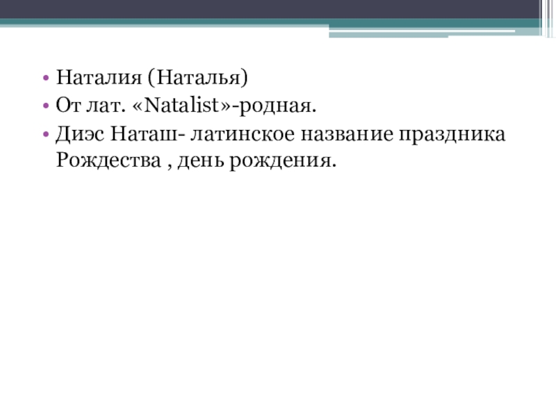 Наталия (Наталья)От лат. «Natalist»-родная.Диэс Наташ- латинское название праздника Рождества , день рождения.