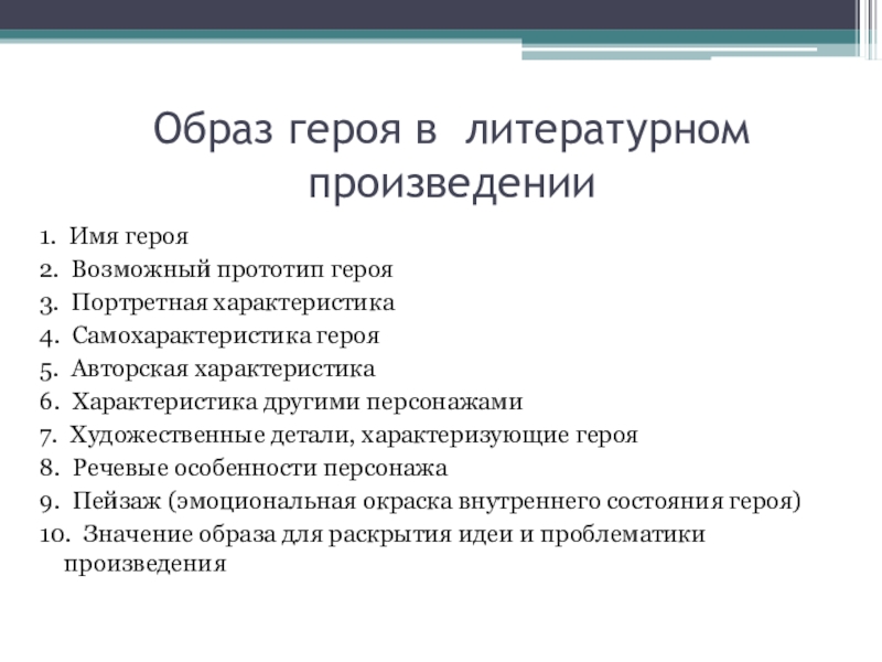 Образ героя в литературном произведении1. Имя героя2. Возможный прототип героя3. Портретная характеристика4. Самохарактеристика героя5. Авторская характеристика6. Характеристика