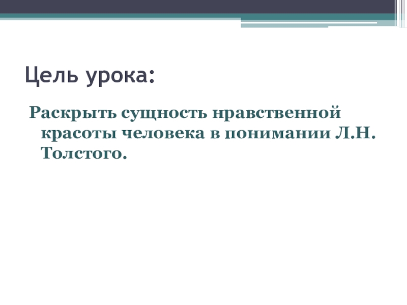 Цель урока:Раскрыть сущность нравственной красоты человека в понимании Л.Н.Толстого.