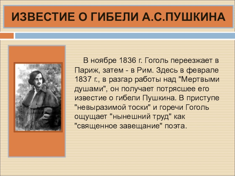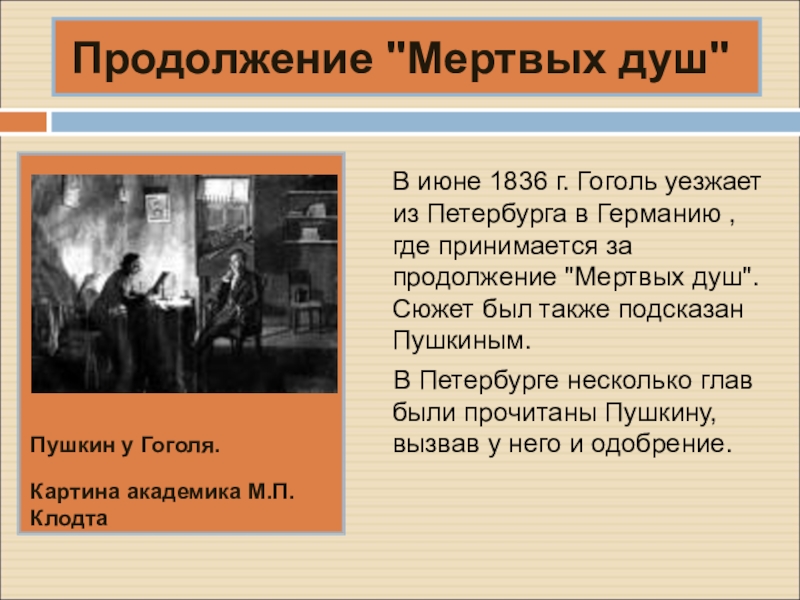 В июне 1836 г. Гоголь уезжает из Петербурга в Германию , где принимается за продолжение "Мертвых душ". Сюжет был также подсказан Пушкиным.