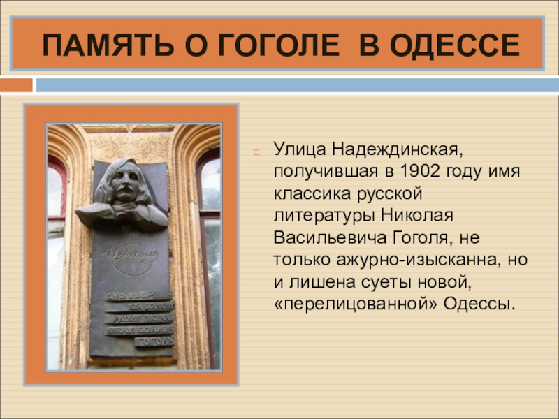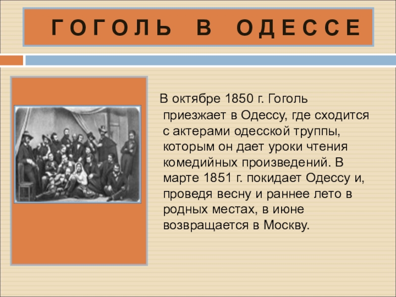 В октябре 1850 г. Гоголь приезжает в Одессу, где сходится с актерами одесской труппы, которым он дает уроки чтения комедийных произведений. В марте 1851 г. покидает Одессу и, проведя весну и раннее лето в родных местах, в июне возвращается в Москву.