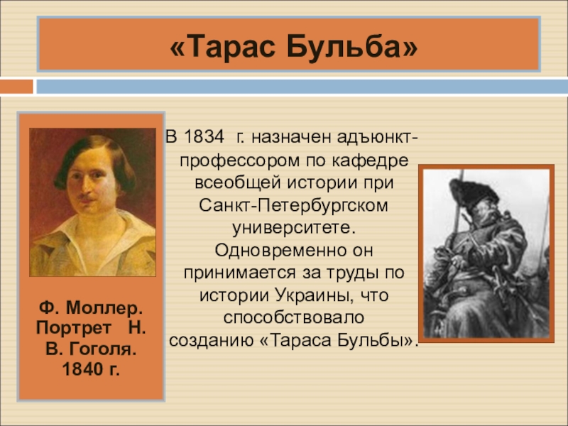 В 1834 г. назначен адъюнкт-профессором по кафедре всеобщей истории при Санкт-Петербургском университете. Одновременно он принимается за труды по истории Украины, что способствовало созданию «Тараса Бульбы».