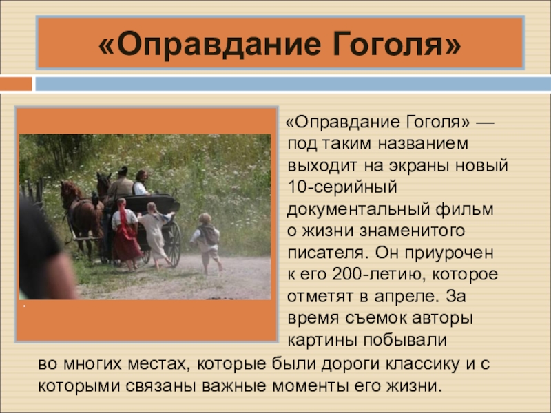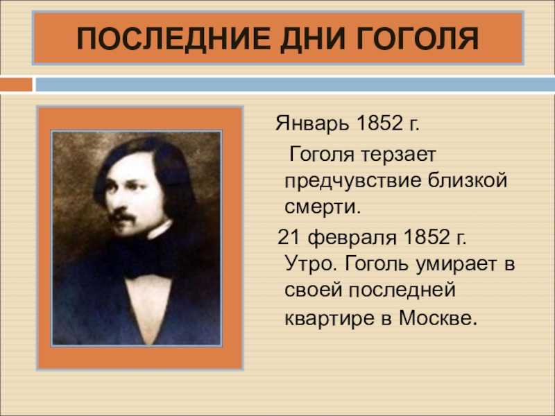 В апреле 1848 г. после паломничества в Святую землю Гоголь окончательно возвращается в Россию, где большую часть времени проводит в Москве, бывает наездами в Петербурге, а также в родных местах - Малороссии.