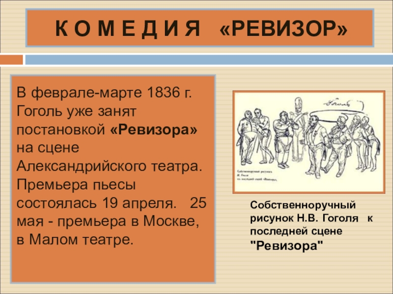 В феврале-марте 1836 г. Гоголь уже занят постановкой «Ревизора» на сцене Александрийского театра. Премьера пьесы состоялась 19 апреля. 25 мая - премьера в Москве, в Малом театре.