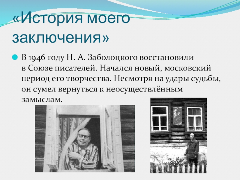 В 1946 году Н. А. Заболоцкого восстановили в Союзе писателей. Начался новый, московский период
