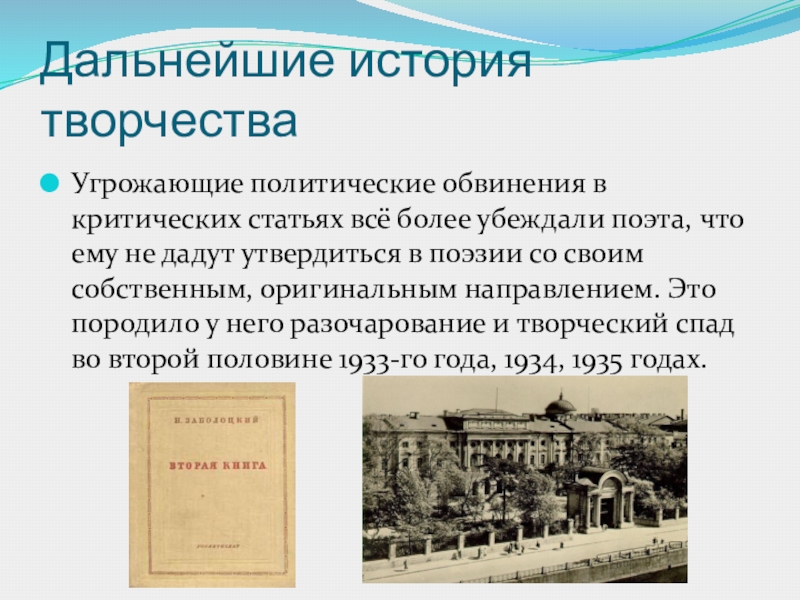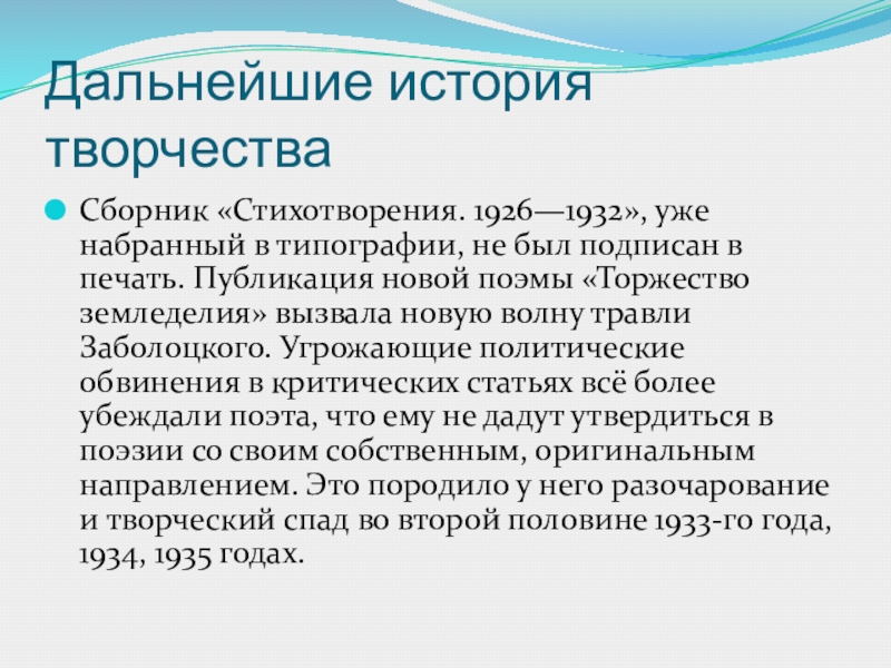 был подписан в печать. Публикация новой поэмы «Торжество земледелия» вызвала новую волну травли Заболоцкого. Угрожающие политические обвинения в критических статьях всё более убеждали поэта, что ему не дадут утвердиться в поэзии со своим собственным, оригинальным направлением. Это породило у него разочарование и творческий спад во второй половине 1933-го года, 1934, 1935 годах.