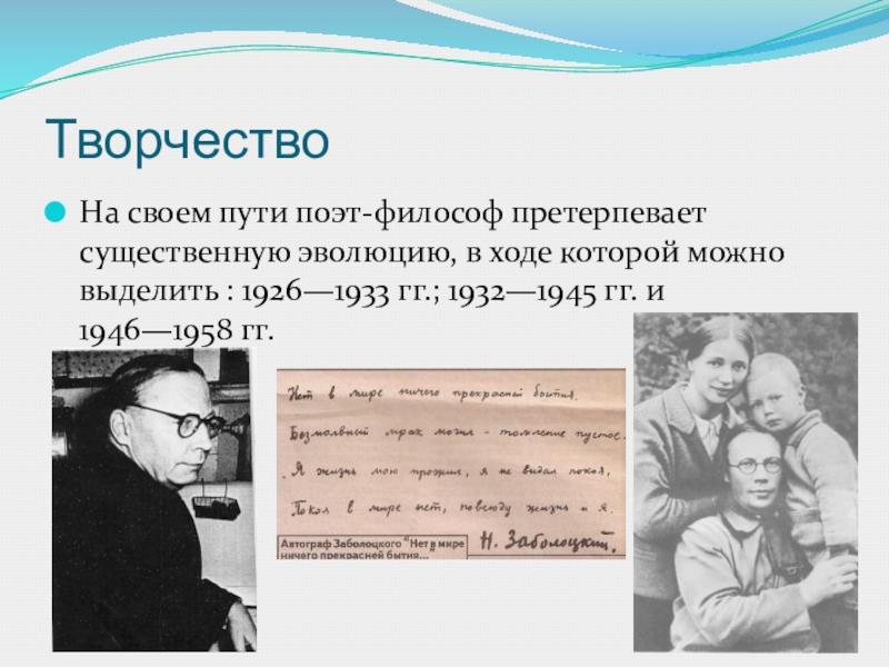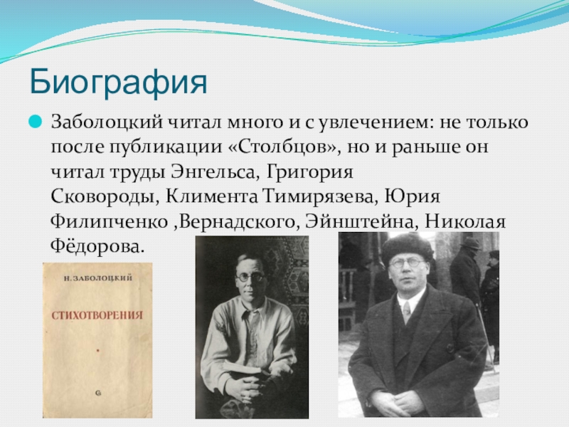 «Столбцов», но и раньше он читал труды Энгельса, Григория Сковороды, Климента Тимирязева, Юрия Филипченко ,Вернадского, Эйнштейна, Николая Фёдорова.