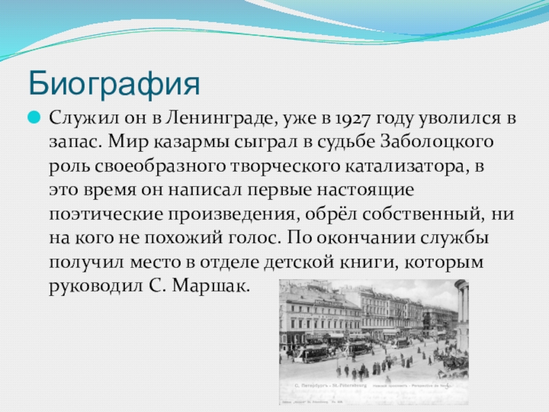 сыграл в судьбе Заболоцкого роль своеобразного творческого катализатора, в это время он написал первые настоящие поэтические произведения, обрёл собственный, ни на кого не похожий голос. По окончании службы получил место в отделе детской книги, которым руководил С. Маршак.