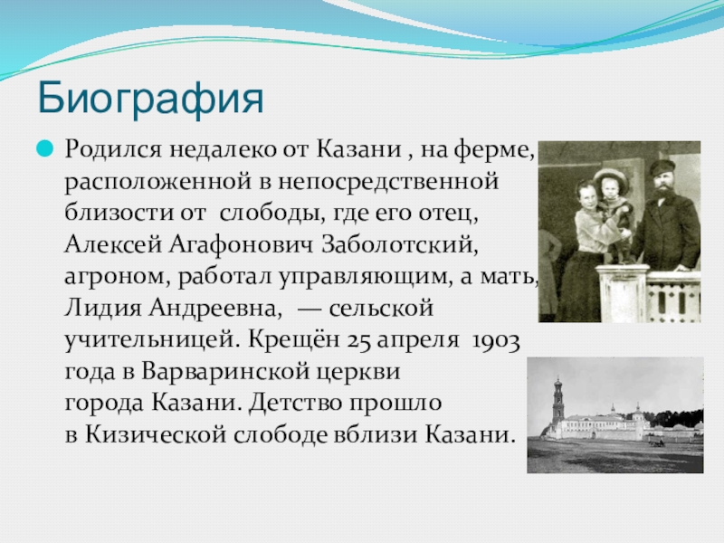 где его отец, Алексей Агафонович Заболотский, агроном, работал управляющим, а мать, Лидия Андреевна, — сельской учительницей. Крещён 25 апреля 1903 года в Варваринской церкви города Казани. Детство прошло в Кизической слободе вблизи Казани.