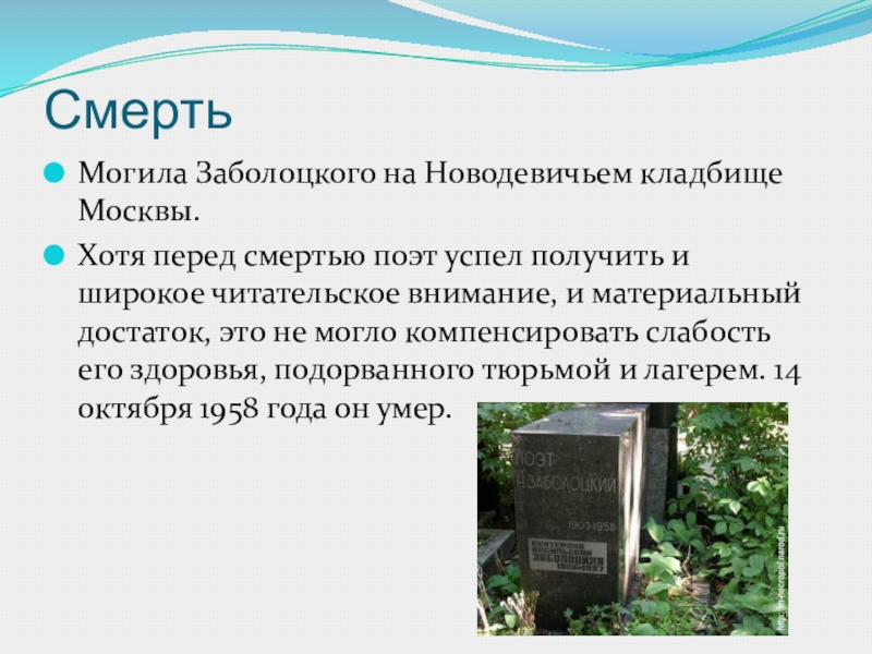и широкое читательское внимание, и материальный достаток, это не могло компенсировать слабость его здоровья, подорванного тюрьмой и лагерем. 14 октября 1958 года он умер.
