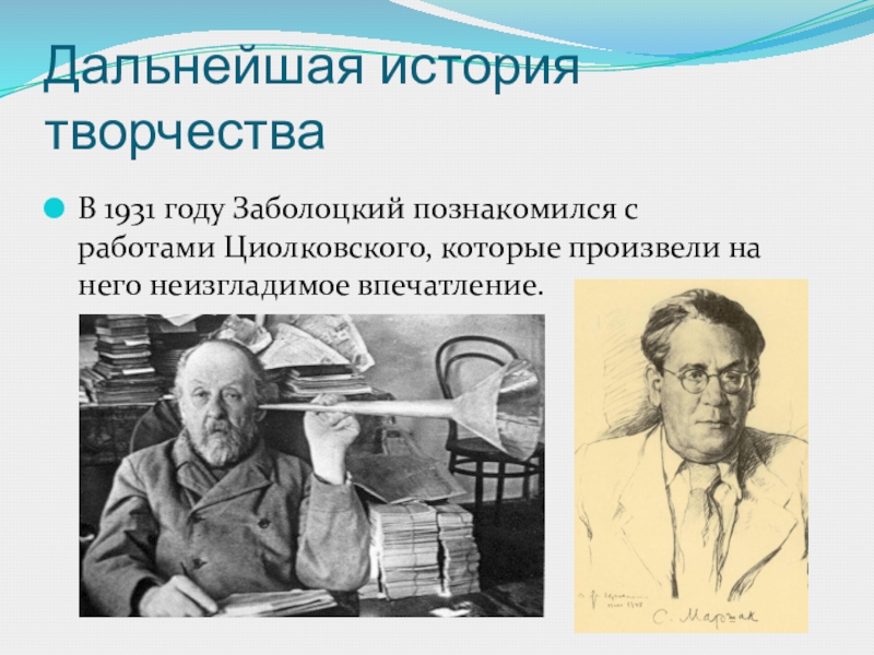 В 1931 году Заболоцкий познакомился с работами Циолковского, которые произвели на него