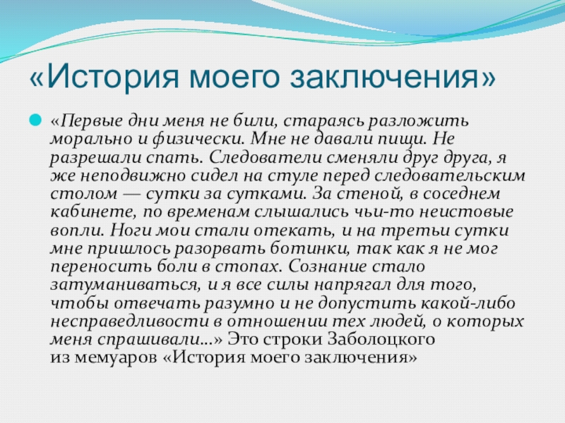 физически. Мне не давали пищи. Не разрешали спать. Следователи сменяли друг друга, я же неподвижно сидел на стуле перед следовательским столом — сутки за сутками. За стеной, в соседнем кабинете, по временам слышались чьи-то неистовые вопли. Ноги мои стали отекать, и на третьи сутки мне пришлось разорвать ботинки, так как я не мог переносить боли в стопах. Сознание стало затуманиваться, и я все силы напрягал для того, чтобы отвечать разумно и не допустить какой-либо несправедливости в отношении тех людей, о которых меня спрашивали…» Это строки Заболоцкого из мемуаров «История моего заключения»