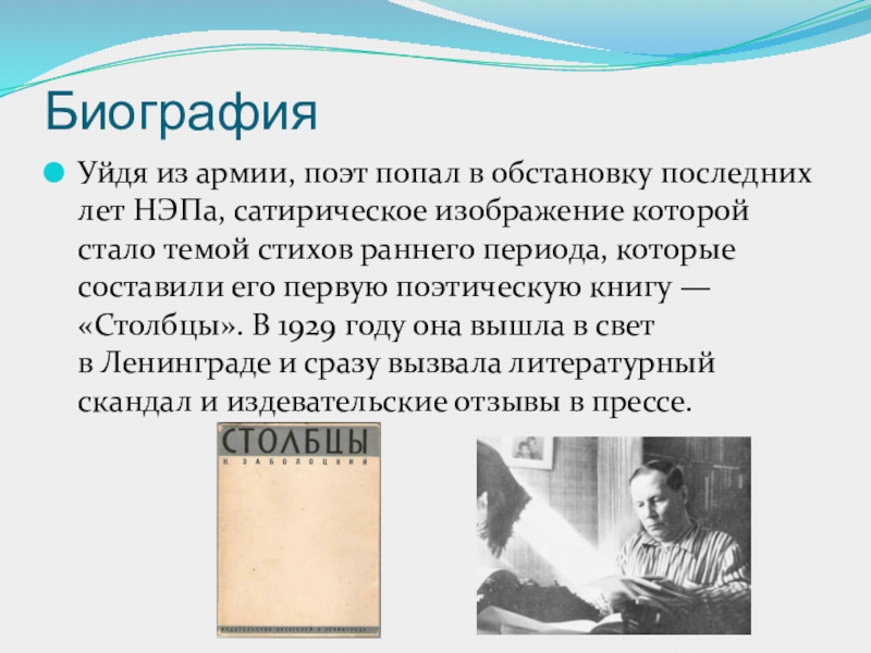 изображение которой стало темой стихов раннего периода, которые составили его первую поэтическую книгу — «Столбцы». В 1929 году она вышла в свет в Ленинграде и сразу вызвала литературный скандал и издевательские отзывы в прессе.