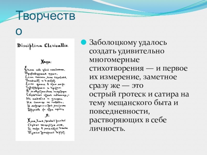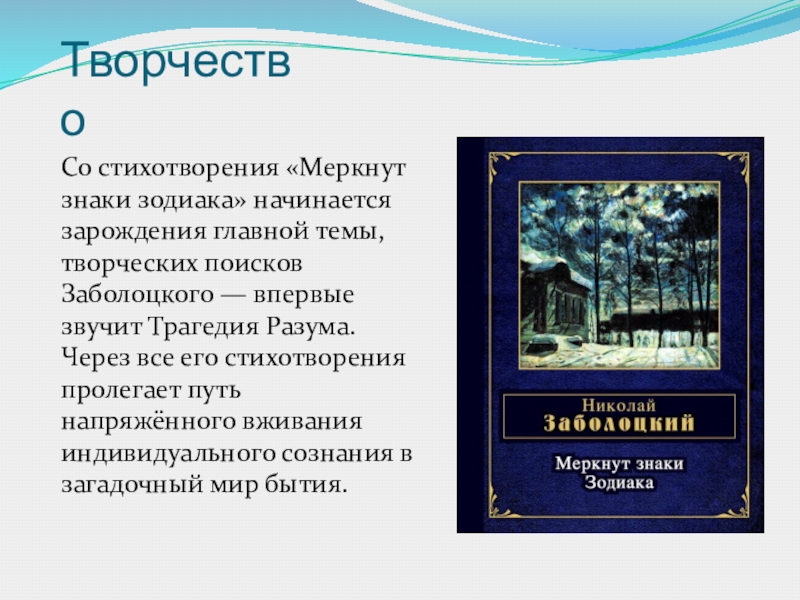 поисков Заболоцкого — впервые звучит Трагедия Разума. Через все его стихотворения пролегает путь напряжённого вживания индивидуального сознания в загадочный мир бытия.