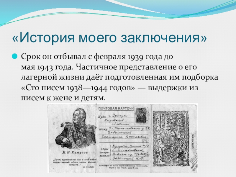 его лагерной жизни даёт подготовленная им подборка «Сто писем 1938—1944 годов» — выдержки из писем к жене и детям.