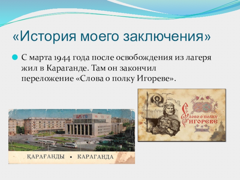 С марта 1944 года после освобождения из лагеря жил в Караганде. Там он