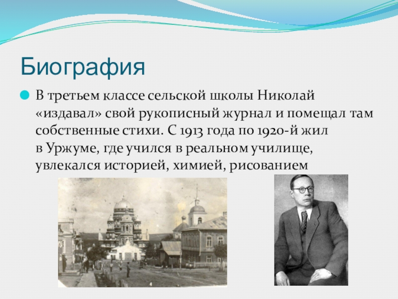 помещал там собственные стихи. С 1913 года по 1920-й жил в Уржуме, где учился в реальном училище, увлекался историей, химией, рисованием
