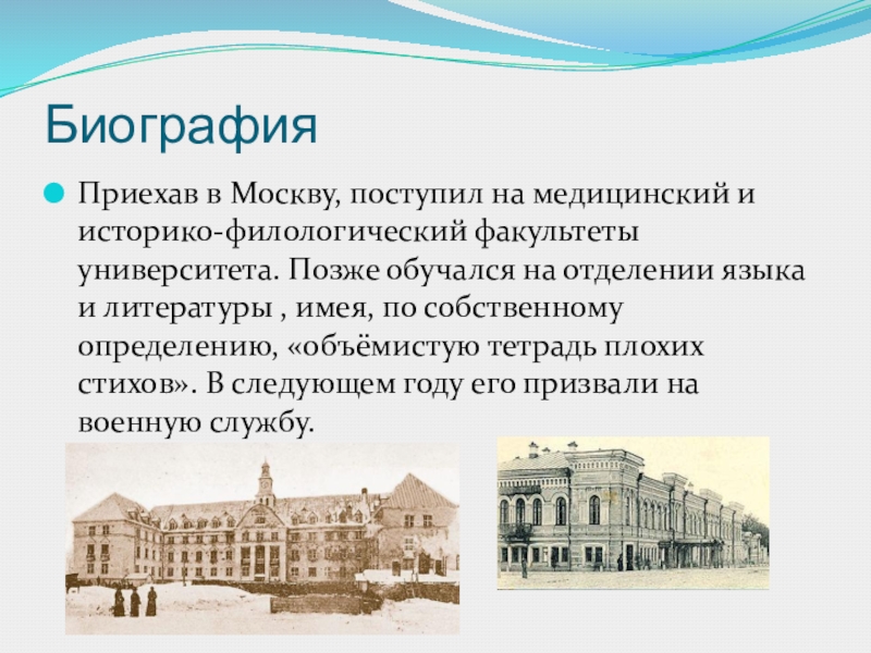 Приехав в Москву, поступил на медицинский и историко-филологический факультеты университета. Позже