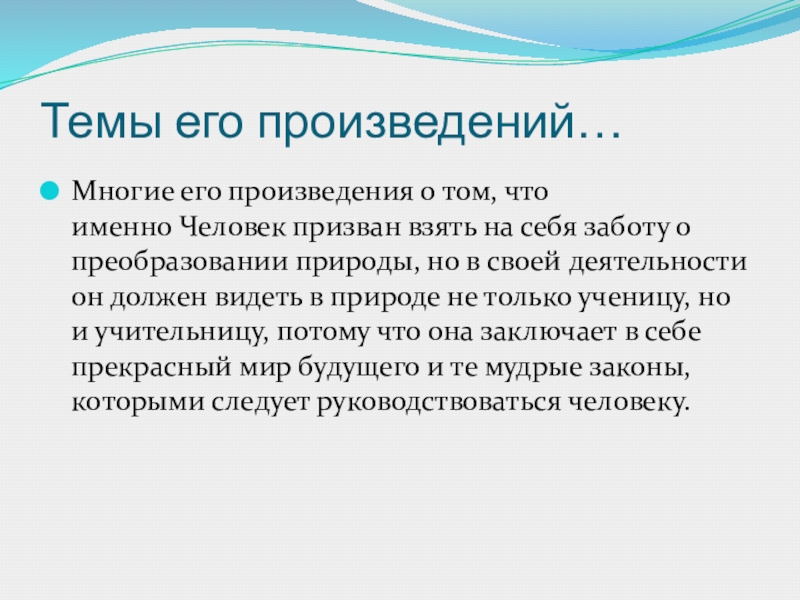 себя заботу о преобразовании природы, но в своей деятельности он должен видеть в природе не только ученицу, но и учительницу, потому что она заключает в себе прекрасный мир будущего и те мудрые законы, которыми следует руководствоваться человеку.