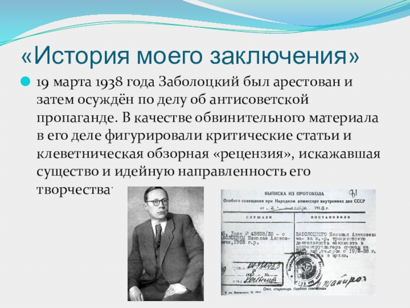 19 марта 1938 года Заболоцкий был арестован и затем осуждён по делу