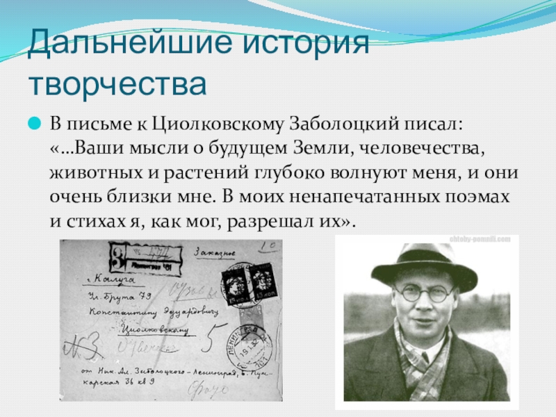 В письме к Циолковскому Заболоцкий писал: «…Ваши мысли