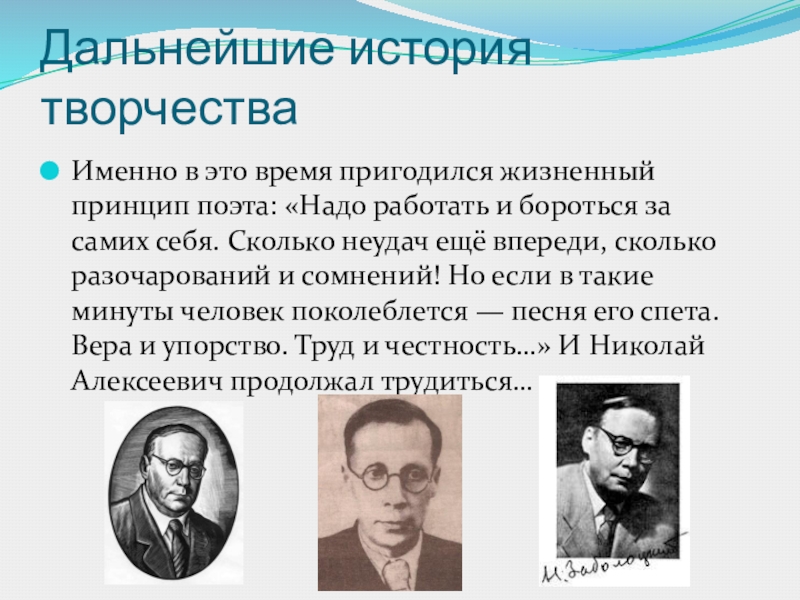 «Надо работать и бороться за самих себя. Сколько неудач ещё впереди, сколько разочарований и сомнений! Но если в такие минуты человек поколеблется — песня его спета. Вера и упорство. Труд и честность…» И Николай Алексеевич продолжал трудиться…
