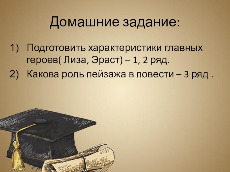 Подготовить характеристики главных героев( Лиза, Эраст) – 1, 2 ряд.