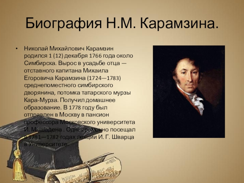 около Симбирска. Вырос в усадьбе отца — отставного капитана Михаила Егоровича Карамзина (1724—1783) среднепоместного симбирского дворянина, потомка татарского мурзы Кара-Мурза. Получил домашнее образование. В 1778 году был отправлен в Москву в пансион профессора Московского университета И. М. Шадена . Одновременно посещал в 1781—1782 годах лекции И. Г. Шварца в Университете.