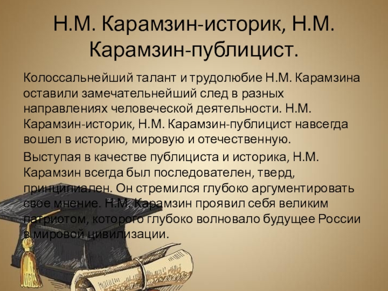 Выступая в качестве публициста и историка, Н.М. Карамзин всегда был последователен, тверд, принципиален. Он стремился глубоко аргументировать свое мнение. Н.М. Карамзин проявил себя великим патриотом, которого глубоко волновало будущее России в мировой цивилизации.