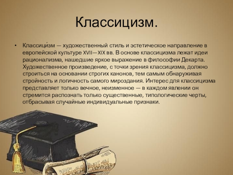 вв. В основе классицизма лежат идеи рационализма, нашедшие яркое выражение в философии Декарта. Художественное произведение, с точки зрения классицизма, должно строиться на основании строгих канонов, тем самым обнаруживая стройность и логичность самого мироздания. Интерес для классицизма представляет только вечное, неизменное — в каждом явлении он стремится распознать только существенные, типологические черты, отбрасывая случайные индивидуальные признаки.