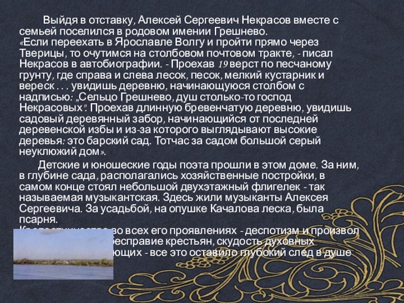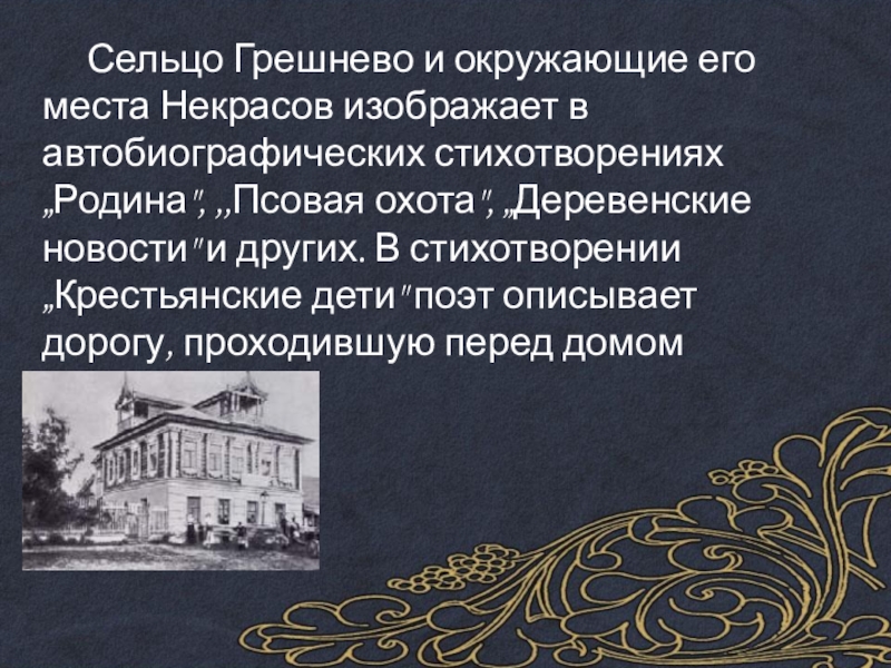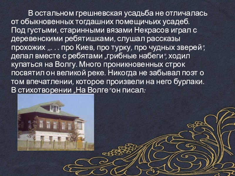«Если переехать в Ярославле Волгу и пройти прямо через Тверицы, то очутимся на столбовом почтовом тракте, - писал Некрасов в автобиографии. - Проехав 19 верст по песчаному грунту, где справа и слева лесок, песок, мелкий кустарник и вереск . . . увидишь деревню, начинающуюся столбом с надписью: „Сельцо Грешнево, душ столько-то господ Некрасовых". Проехав длинную бревенчатую деревню, увидишь садовый деревянный забор, начинающийся от последней деревенской избы и из-за которого выглядывают высокие деревья: это барский сад. Тотчас за садом большой серый неуклюжий дом».