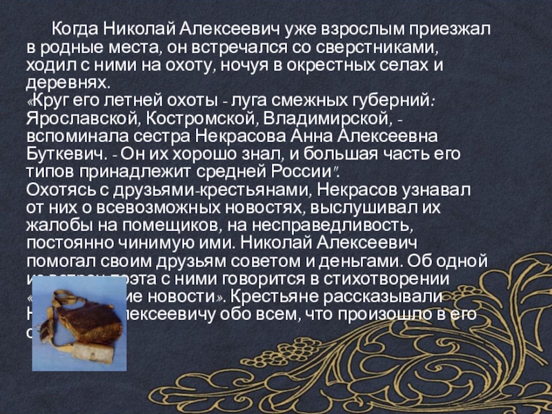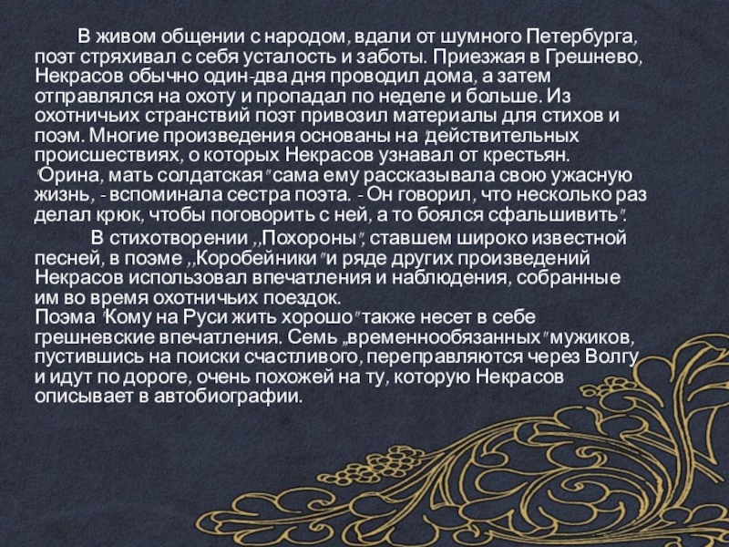 с народом, вдали от шумного Петербурга, поэт стряхивал с себя усталость и заботы. Приезжая в Грешнево, Некрасов обычно один-два дня проводил дома, а затем отправлялся на охоту и пропадал по неделе и больше. Из охотничьих странствий поэт привозил материалы для стихов и поэм. Многие произведения основаны на 'действительных происшествиях, о которых Некрасов узнавал от крестьян.