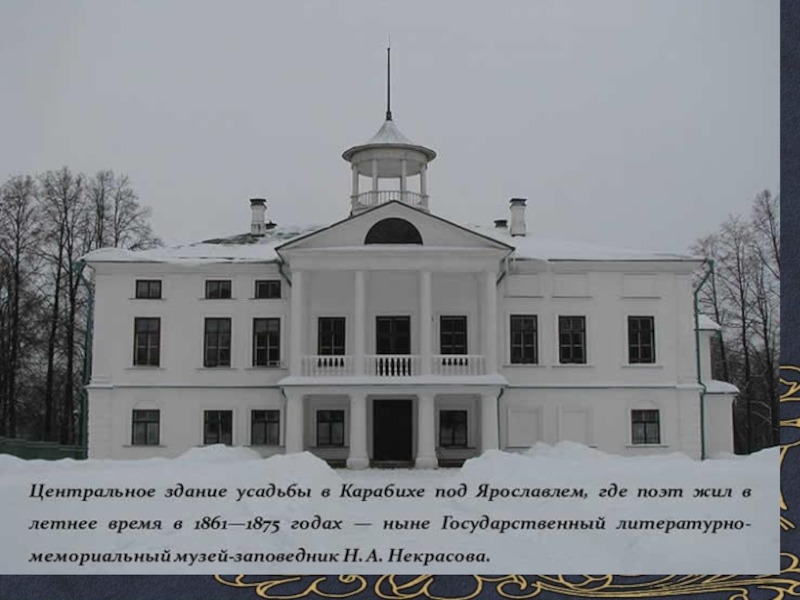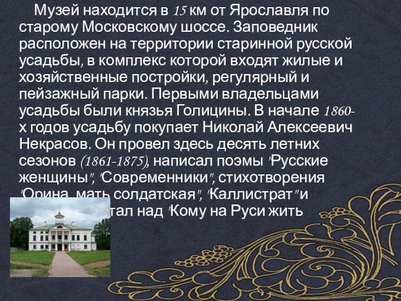 по старому Московскому шоссе. Заповедник расположен на территории старинной русской усадьбы, в комплекс которой входят жилые и хозяйственные постройки, регулярный и пейзажный парки. Первыми владельцами усадьбы были князья Голицины. В начале 1860-х годов усадьбу покупает Николай Алексеевич Некрасов. Он провел здесь десять летних сезонов (1861-1875), написал поэмы "Русские женщины", "Современники", стихотворения "Орина, мать солдатская", "Каллистрат" и другие, работал над "Кому на Руси жить хорошо".