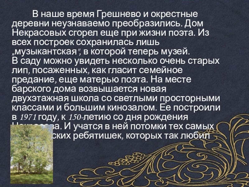В саду можно увидеть несколько очень старых лип, посаженных, как гласит семейное предание, еще матерью поэта. На месте барского дома возвышается новая двухэтажная школа со светлыми просторными классами и большим кинозалом. Ее построили в 1971 году, к 150-летию со дня рождения Некрасова. И учатся в ней потомки тех самых крестьянских ребятишек, которых так любил поэт.