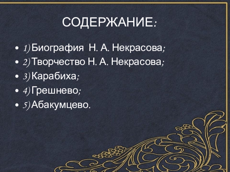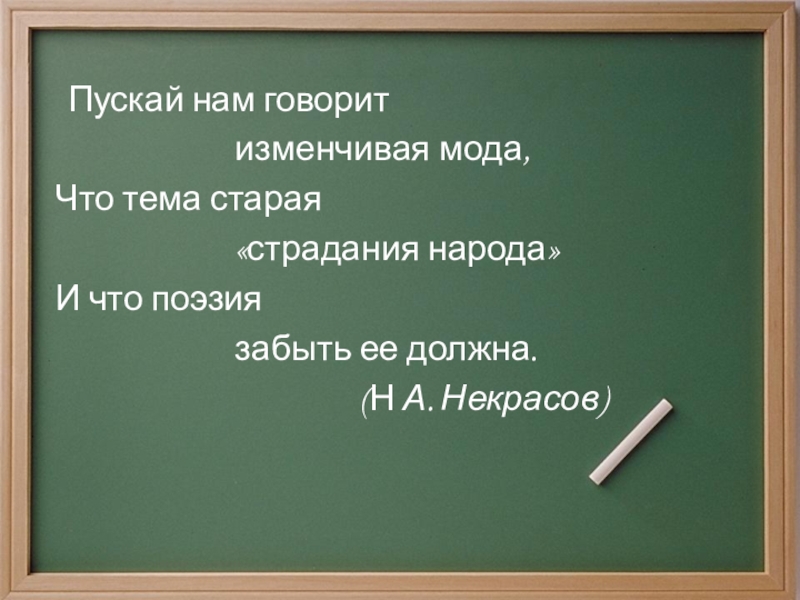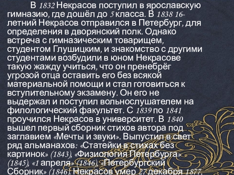 поступил в ярославскую гимназию, где дошёл до 5 класса. В 1838 16-летний Некрасов отправился в Петербург, для определения в дворянский полк. Однако встреча с гимназическим товарищем, студентом Глушицким, и знакомство с другими студентами возбудили в юном Некрасове такую жажду учиться, что он пренебрёг угрозой отца оставить его без всякой материальной помощи и стал готовиться к вступительному экзамену. Он его не выдержал и поступил вольнослушателем на филологический факультет. С 1839 по 1841 проучился Некрасов в университет. В 1840 вышел первый сборник стихов автора под заглавием «Мечты и звуки». Выпустил в свет ряд альманахов: «Статейки в стихах без картинок» (1843), «Физиология Петербурга» (1845), «1 апреля» (1846), «Петербургский Сборник» (1846). Некрасов умер 27 декабря 1877, но написанные им перед смертью произведения принадлежат к лучшим созданиям его музы.