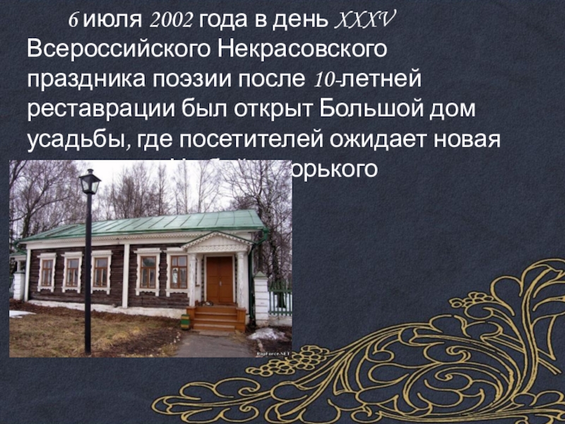 день XXXV Всероссийского Некрасовского праздника поэзии после 10-летней реставрации был открыт Большой дом усадьбы, где посетителей ожидает новая экспозиция "Не бойся горького забвенья...".