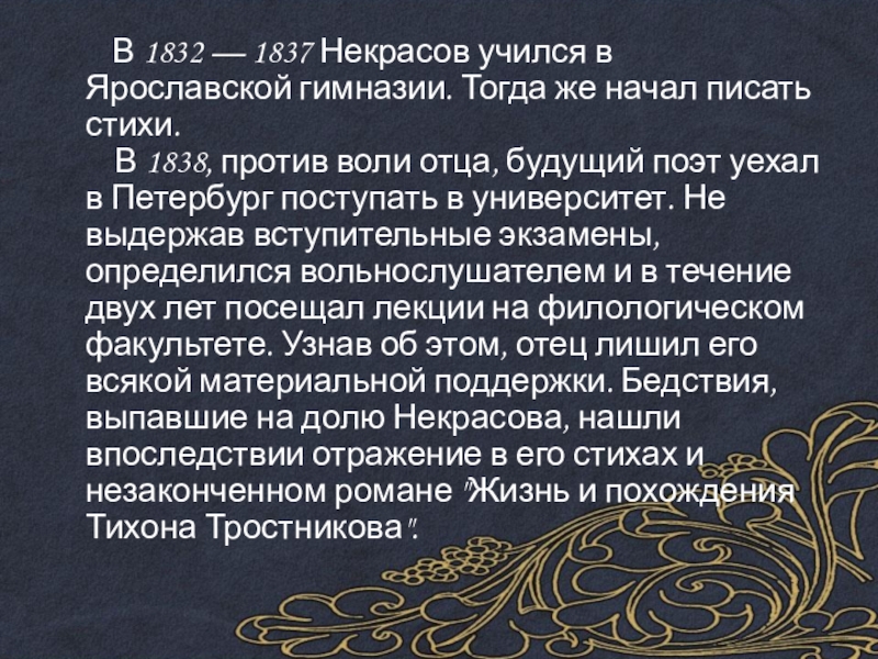 В 1838, против воли отца, будущий поэт уехал в Петербург поступать в университет. Не выдержав вступительные экзамены, определился вольнослушателем и в течение двух лет посещал лекции на филологическом факультете. Узнав об этом, отец лишил его всякой материальной поддержки. Бедствия, выпавшие на долю Некрасова, нашли впоследствии отражение в его стихах и незаконченном романе "Жизнь и похождения Тихона Тростникова".