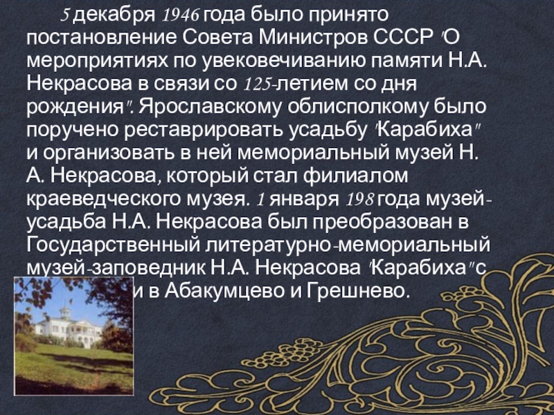 постановление Совета Министров СССР "О мероприятиях по увековечиванию памяти Н.А. Некрасова в связи со 125-летием со дня рождения". Ярославскому облисполкому было поручено реставрировать усадьбу "Карабиха" и организовать в ней мемориальный музей Н.А. Некрасова, который стал филиалом краеведческого музея. 1 января 198 года музей-усадьба Н.А. Некрасова был преобразован в Государственный литературно-мемориальный музей-заповедник Н.А. Некрасова "Карабиха" с филиалами в Абакумцево и Грешнево.