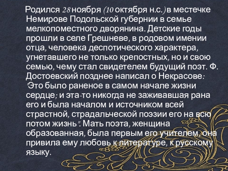 Подольской губернии в семье мелкопоместного дворянина. Детские годы прошли в селе Грешневе, в родовом имении отца, человека деспотического характера, угнетавшего не только крепостных, но и свою семью, чему стал свидетелем будущий поэт. Ф. Достоевский позднее написал о Некрасове: "Это было раненое в самом начале жизни сердце; и эта-то никогда не заживавшая рана его и была началом и источником всей страстной, страдальческой поэзии его на всю потом жизнь". Мать поэта, женщина образованная, была первым его учителем, она привила ему любовь к литературе, к русскому языку.