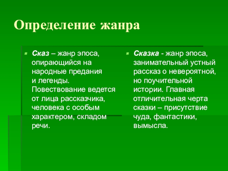 Сказка - жанр эпоса, занимательный устный рассказ о невероятной, но поучительной истории. Главная отличительная черта сказки – присутствие чуда, фантастики, вымысла.