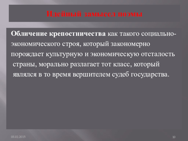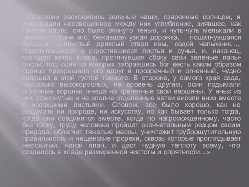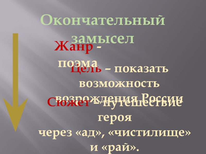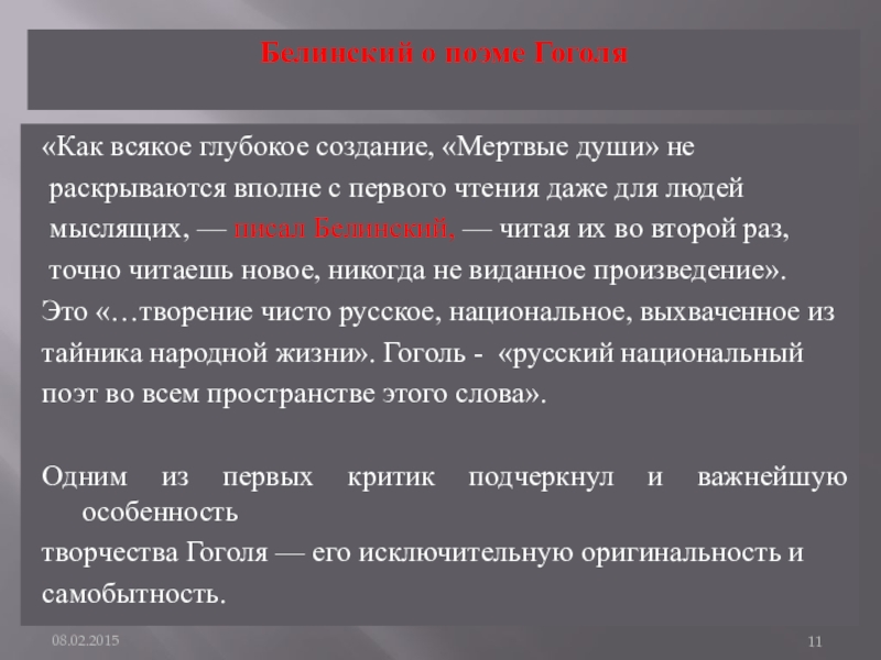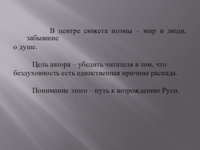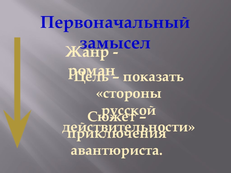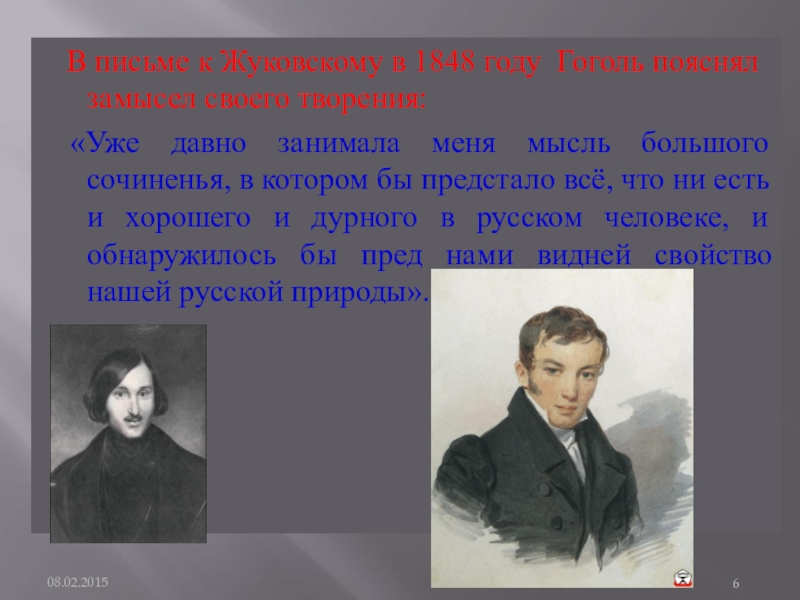 «Уже давно занимала меня мысль большого сочиненья, в котором бы предстало всё, что ни есть и хорошего и дурного в русском человеке, и обнаружилось бы пред нами видней свойство нашей русской природы».