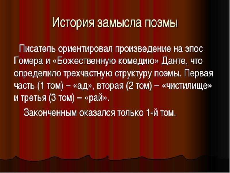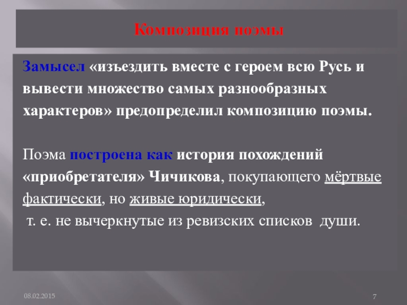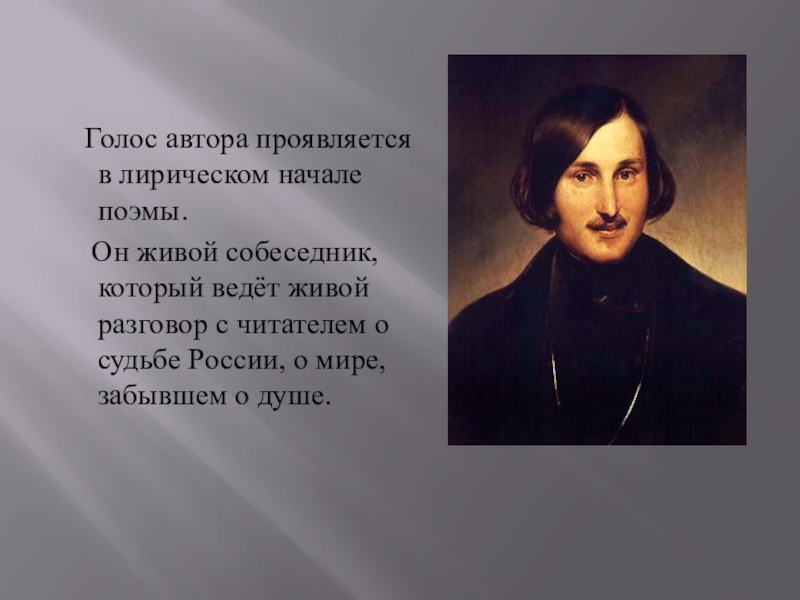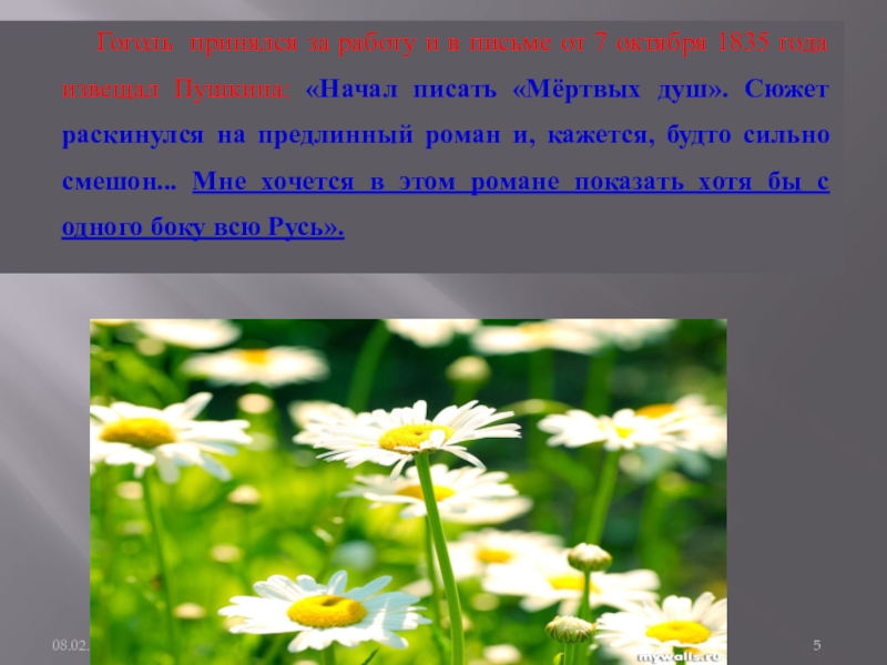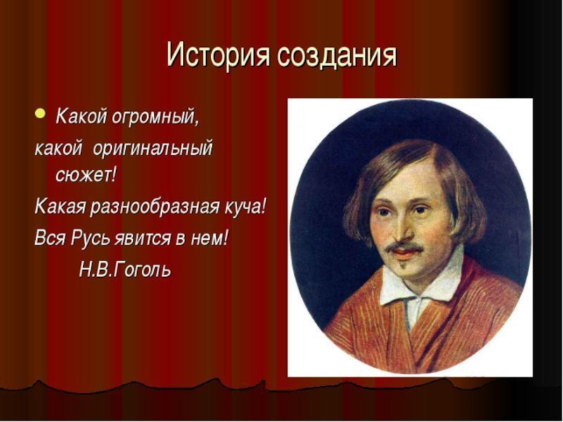 письме от 7 октября 1835 года извещал Пушкина: «Начал писать «Мёртвых душ». Сюжет раскинулся на предлинный роман и, кажется, будто сильно смешон... Мне хочется в этом романе показать хотя бы с одного боку всю Русь».