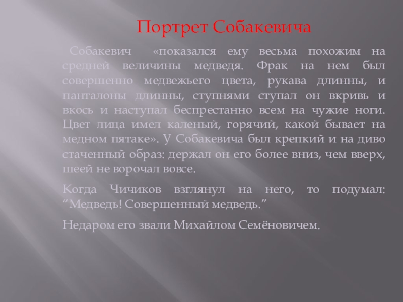 Чичиков открыл рот, с тем чтобы заметить, что Михеева, однако же, давно нет на свете; но Собакевич вошел, как говорится, в самую силу речи, откуда взялась рысь и дар слова».